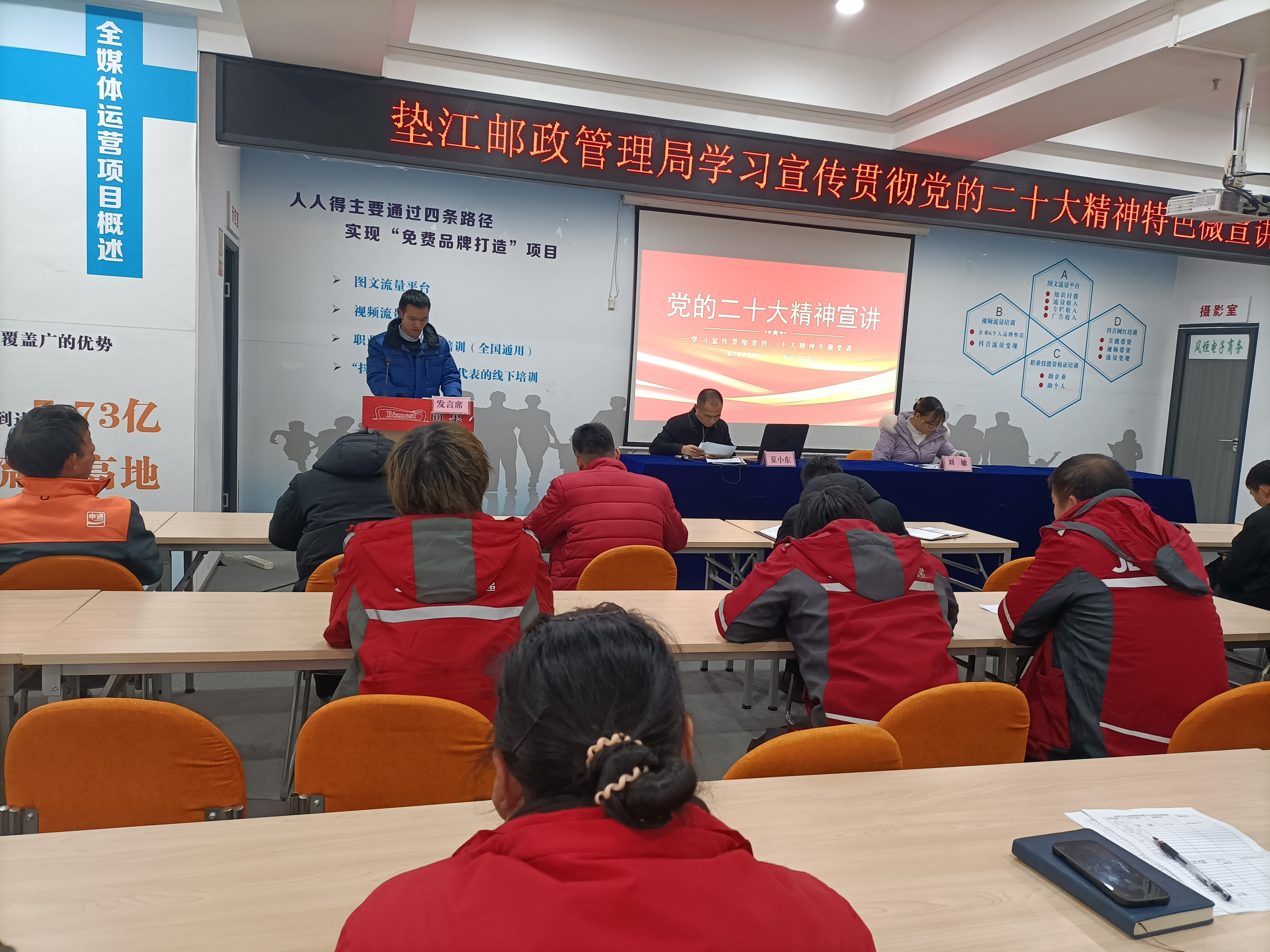 为了深刻领会党的二十大报告精神实质和思想内涵,切实把全县广大干部群众的思想和行动统一到会议精神上来,2月8日,垫江局组织开展365英超_bt365娱乐官网_365bet官网平台网址快递业“二十大精神特色微宣讲”活动。各企业负责人、行业党员、部分从业人员代表共100余人参加此次宣讲活动。