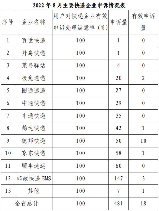 用户对快递企业有效申诉处理满意率为100%,比去年同期提升16.7个百分点。